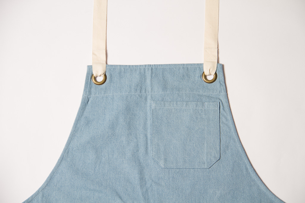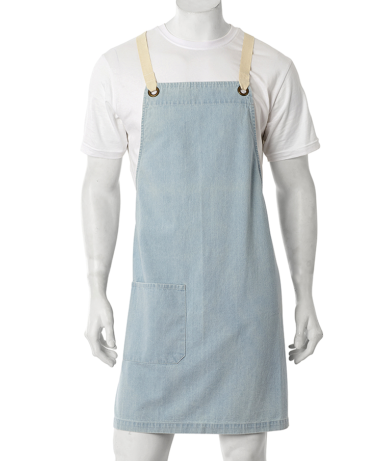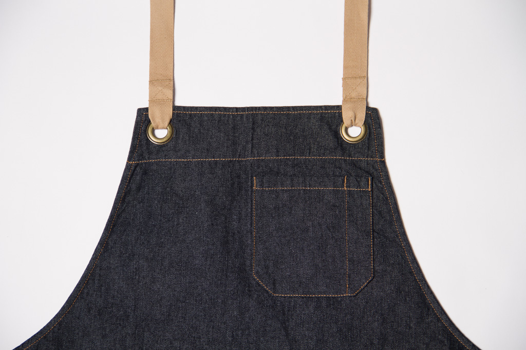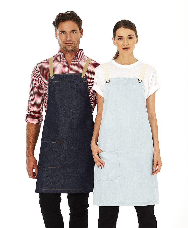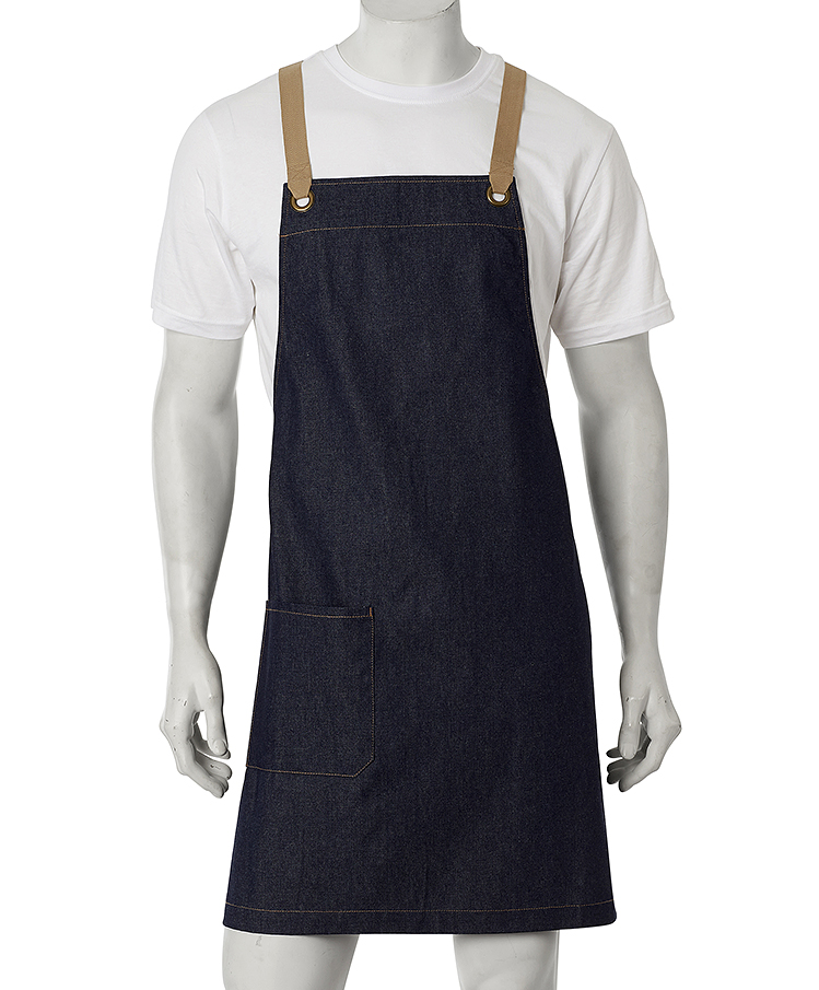 Original Denim Bib Apron with contrast straps 100% cotton indigo denim. Cross over webbing ties. Re-inforced designer brass rivets. Waist pockets