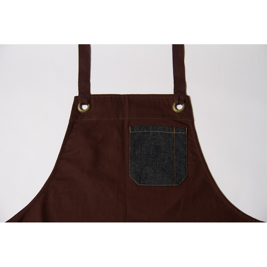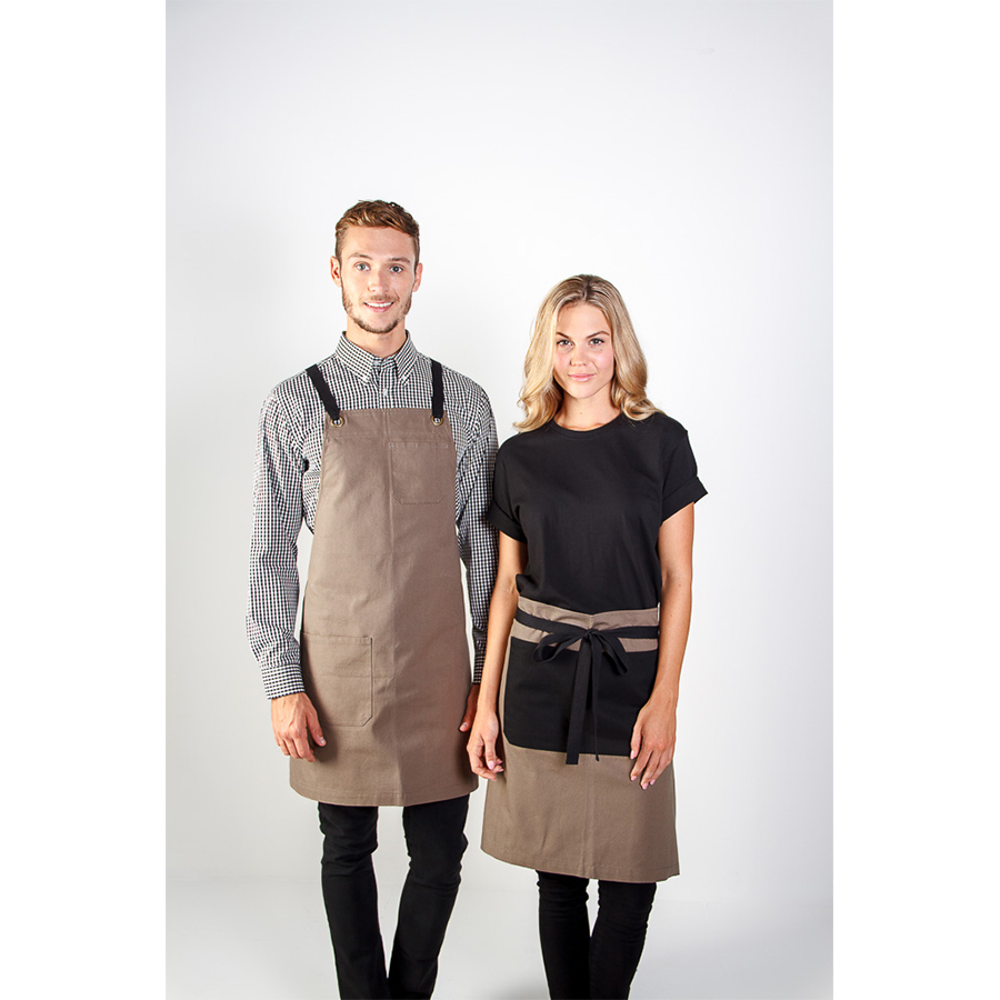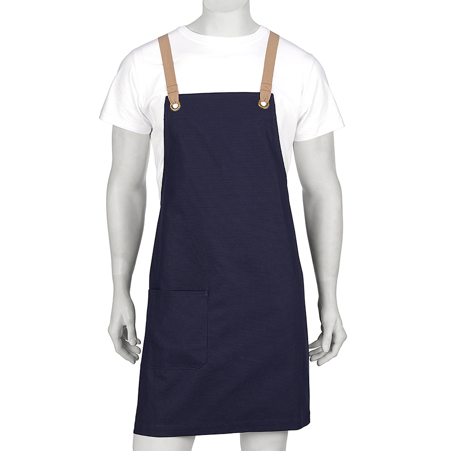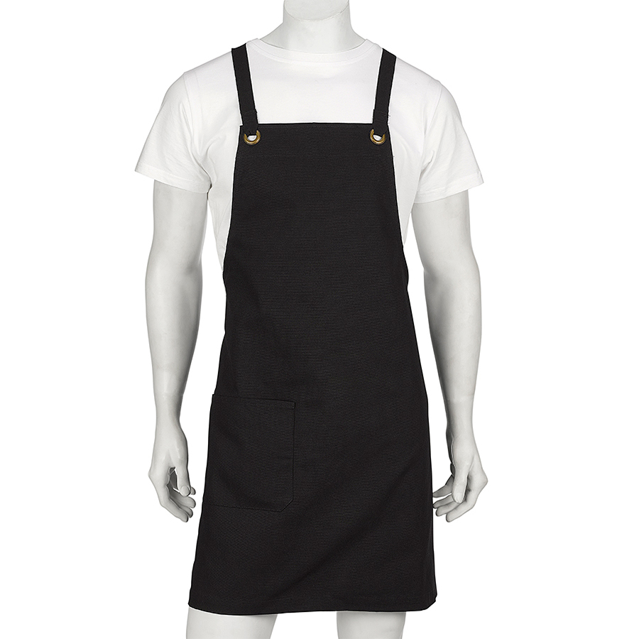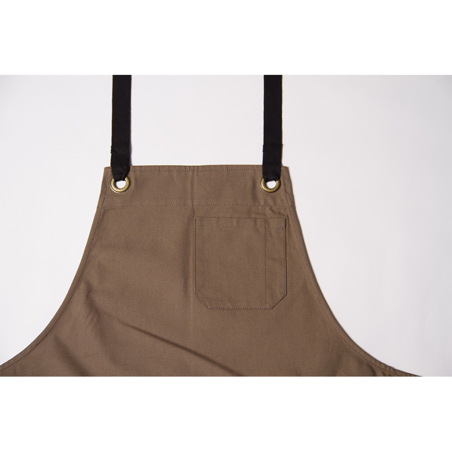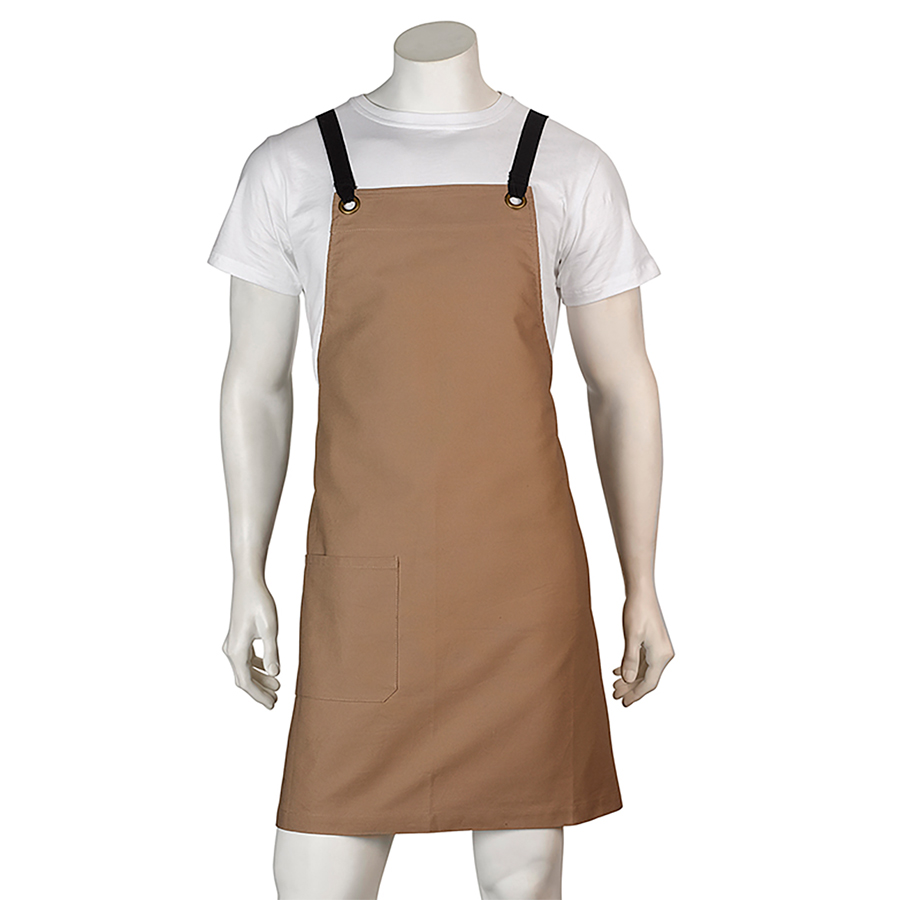 Canvas Bib Apron 100% cotton canvas. Cross over webbing ties. Re-inforced designer brass rivets. Waist pockets