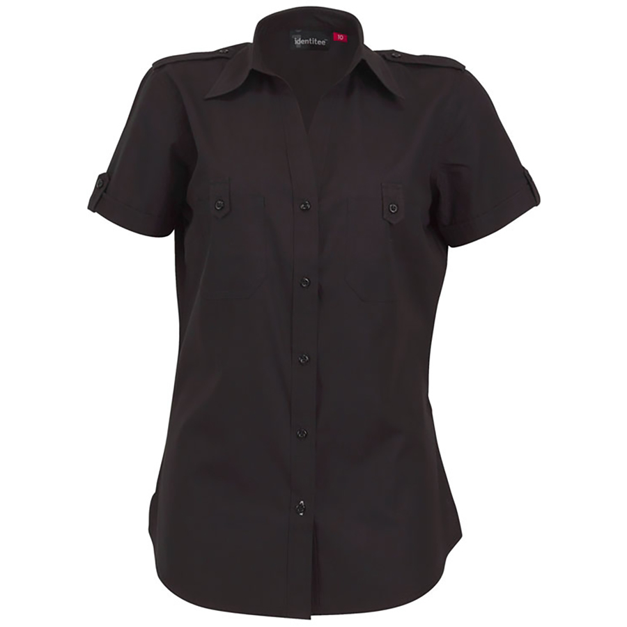 Ladies Short Sleeve Shirt with Pockets. Eppaulette & Tab on Sleeve 60% cotton 40% polyester. Peach finish. Slightly fitted. Curved hem front & back. Eppaulette on Shoulder. Tab on pocket & side of sleeve. Subtle seam & stitch detail. SIZE RANGE 6 – 20