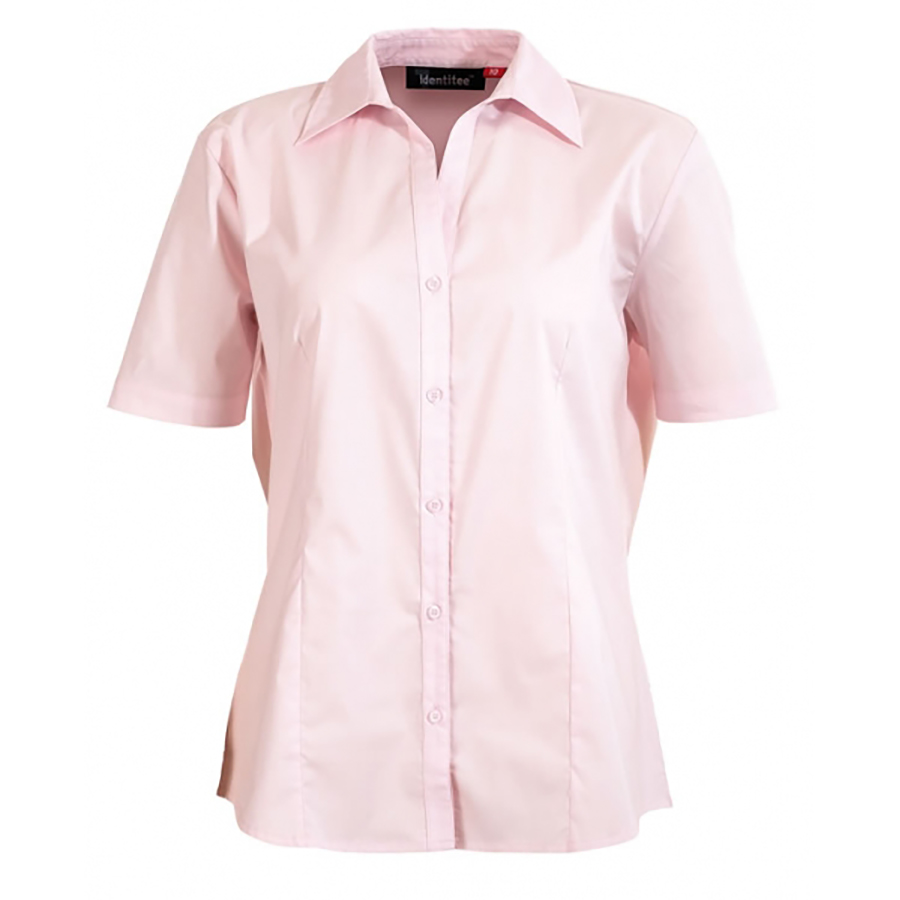 Ladies Short Sleeve Spandex Business Shirt Cotton rich. 34% polyester 62% cotton 4% spandex. Open V-Neckline. Buttons dyed to match. Corporate classic SIZE RANGE 8 – 26