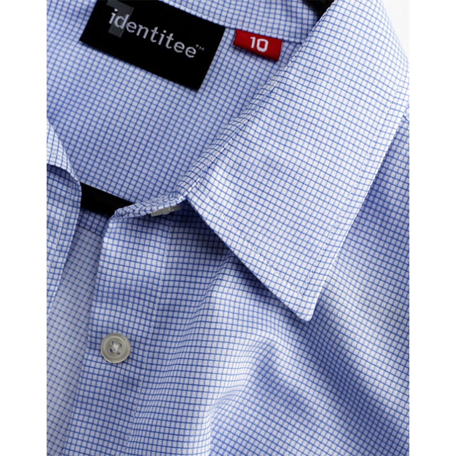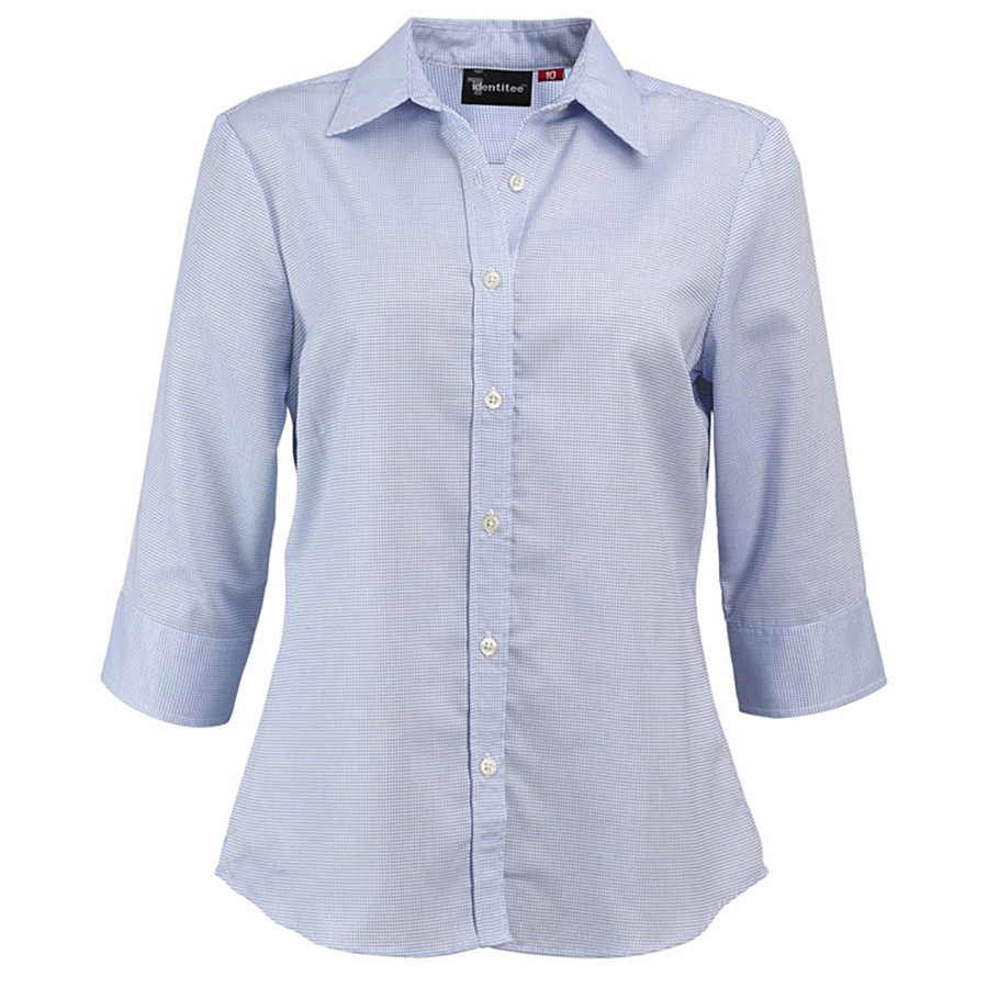Ladies 34 Sleeve Corporate Check Shirt 60% Cotton 40% polyester. Textured yarn dyed check. European collar & cuff. Single pocket. Pearl buttons SIZE RANGE 8 – 26