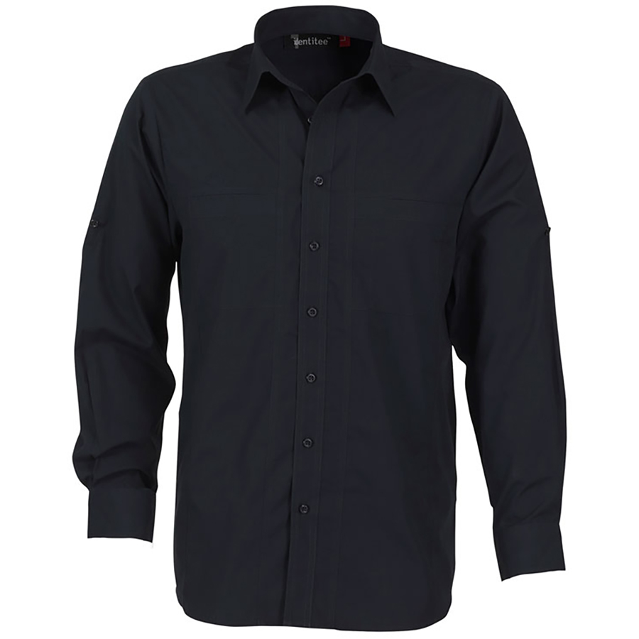 Mens Long Sleeve Shirt with Pockets. Panels & Stitch Detail 60% cotton 40% polyester. Peach finish. Seam & stitch detail on Panels. Collar & Placket. Roll-Tab-Sleeve. Gentle curve hem. Buttons to match SIZE RANGE S – 7XL