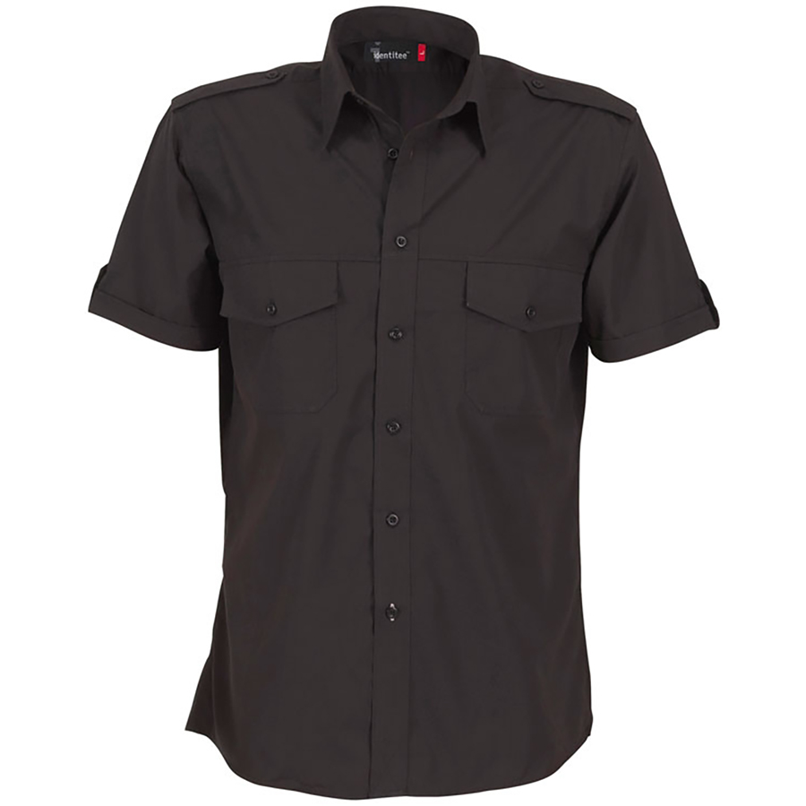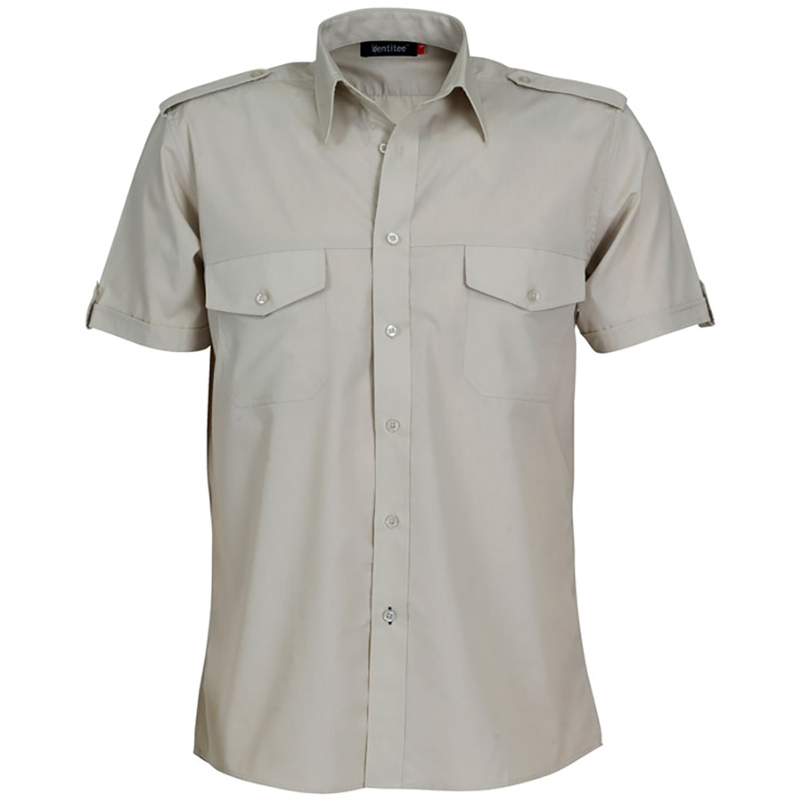 Mens Short Sleeve Shirt with Pockets. Eppaulette & Tab on Sleeve 60% cotton 40% polyester. Peach finish. Slightly fitted. Curved hem front & back. Eppaulette on Shoulder. Tab on Side of sleeve. Subtle seam & stitch detail. SIZE RANGE S – 5XL