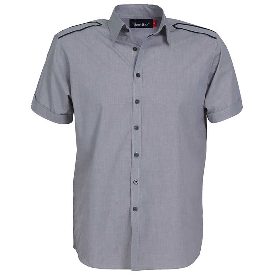 Mens Short Sleeve Mini Check Shirt with Epaulette 60% cotton 40% polyester. Mini Check. Contrast trim details to match. Stitched down eppaulette. Placket sleeve cuff. Gentle curve hem SIZE RANGE S – 5XL