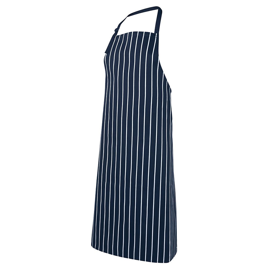 65% Polyester for durability. and 35% Cotton drill for comfort.195gsm yarn dyed stripe fabric.Herringbone adjustable neck strap with slider.Herringbone waist strap.One-size-fits-most.Easy care fabric.86cmx93cm Sizes: BIB 86 x 93cm