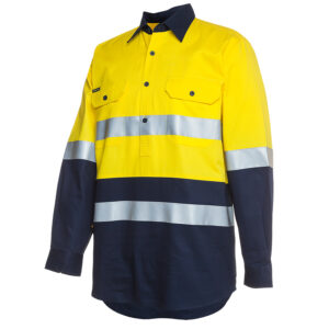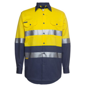 100% Cotton for 100% comfort.150gsm double pre-shrunk drill.Complies with Standard AS/NZS 4399:2017 for UPF Protection (UPF 50 ).Complies with Standards AS/NZS 1906.4:2010 and AS/NZS 4602.1:2011 Day Only.Wide back neck yoke with concealed mesh. cooling gussets at underarms.Two front pockets with button-down flaps and pen insert.Contrast panel on front. back. long sleeves and collar.Curved hem with back tail styling.Two-piece collar Sizes: S|M|L|XL|2XL|3XL|4XL|5XL|6/7XL