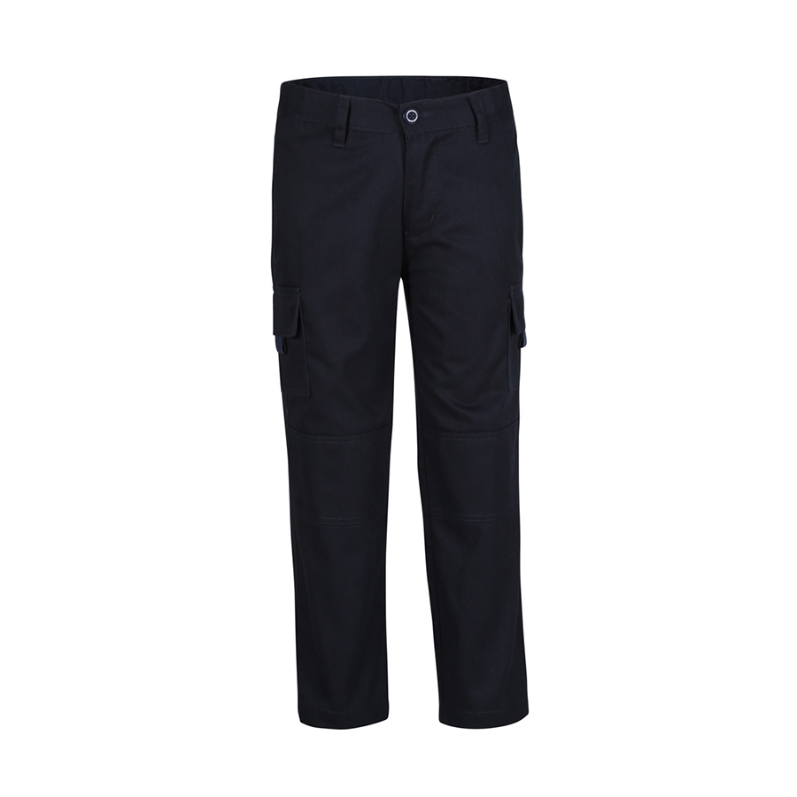 65% polyester for durability 35% cotton for comfort.240gsm twill fabric.Constructed front waist.Elasticated back waistband with internal button for adjustment.Two side pockets. right pocket with zip closure.Two back patch pockets.Cargo pocket on each side of the leg with flap and Hook-Pile tape closure and webbing pulls.YKK zip.Pant with knee patch Sizes: 4|6|8|10|12