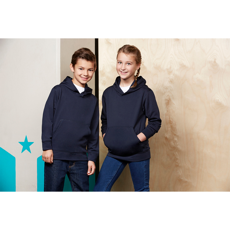 SIZES 4 – 16 FABRIC 100% Polyester Performance Fleece 245 GSM FEATURES Kangaroo front pocket No drawstring in hood – keeping kids safe Matching loose-fit hem ribbing