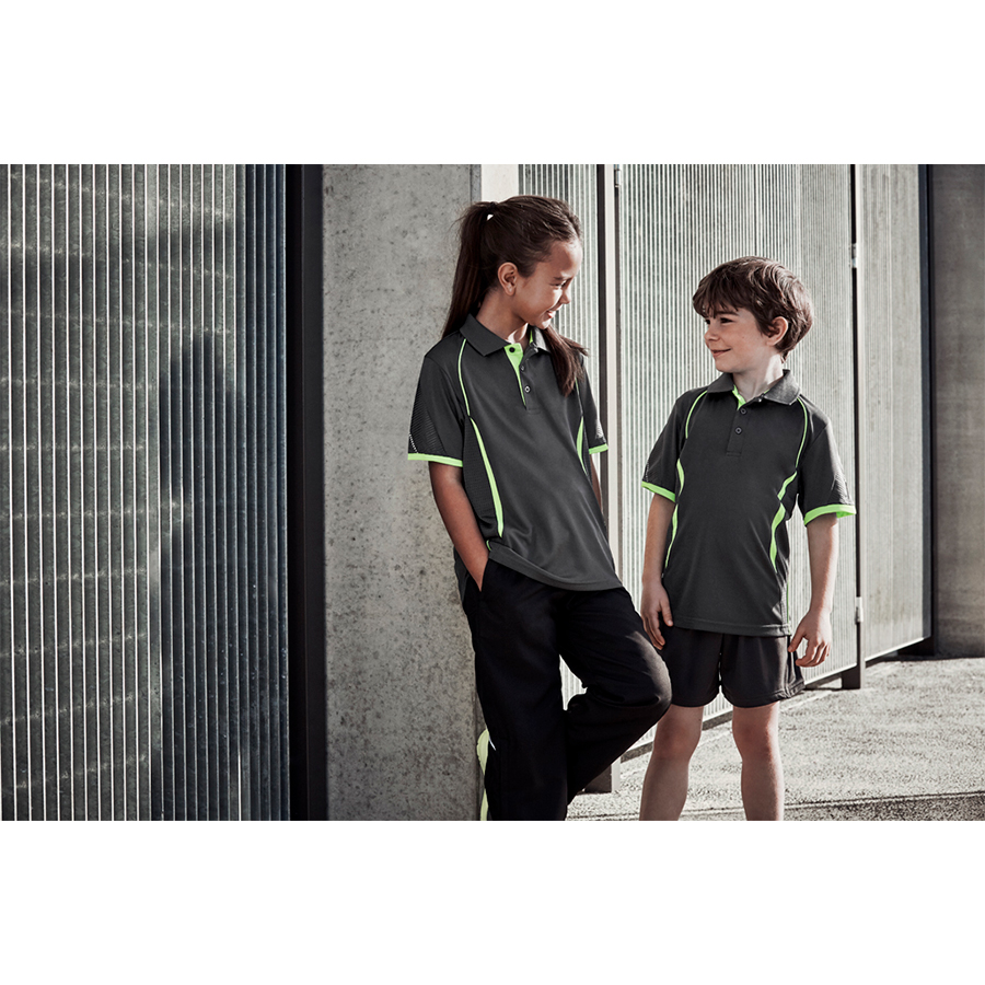 SIZES 4 – 16 FABRIC 100% BIZ COOL™ Polyester Sports Interlock 155 GSM UPF rating – Excellent FEATURES Grid mesh underarm panels for breathability Unique sleeve print feature Contrast panels and piping Knitted collar with contrast placket