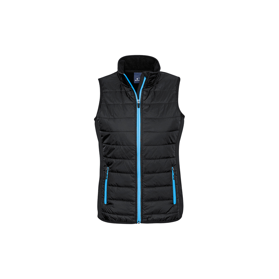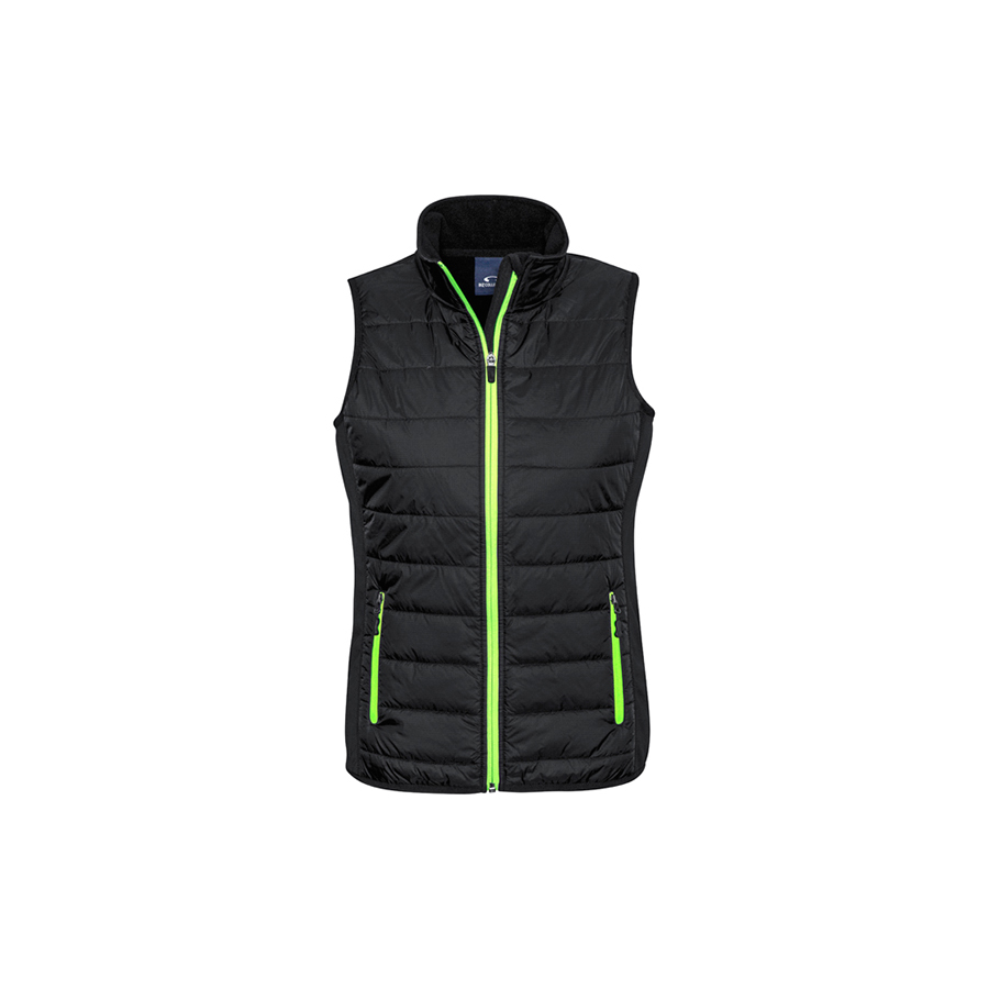 SIZES XS – 2XL FABRIC Front Body: 100% Quilted Nylon Ripstop Back: 95% Polyester 5% Elastane Stretch Bonded Fleece Insulation: 100% Hi-loft Polyfill FEATURES Insulated quilting on chest front for lightweight warmth Contrast front zipper and pockets Stand up collar with chin guard