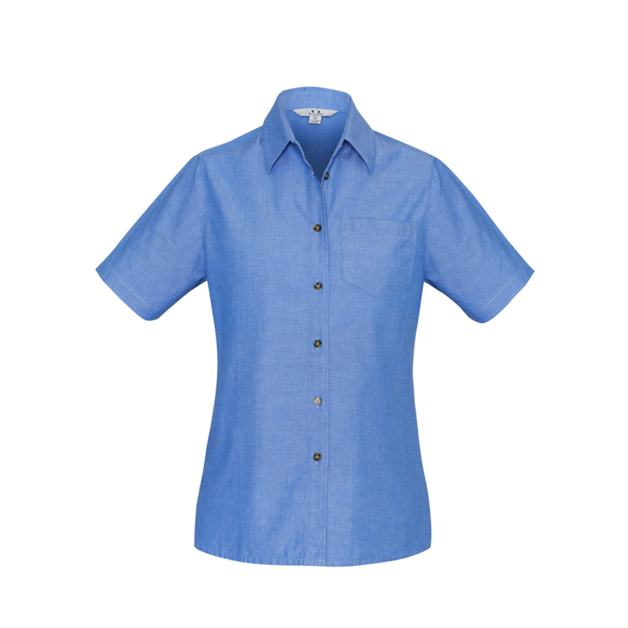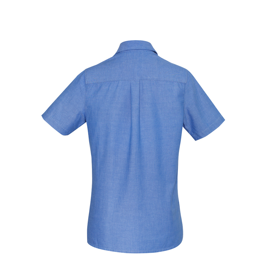SIZES 8 – 24 FABRIC 100% Cotton with Wrinkle Free Treatment Easy iron – yarn dyed fabric UPF rating – Very Good FEATURES Relaxed fit with straight hemline and side splits One left chest pocket Available in Chambray Blue with Tortoise shell buttons