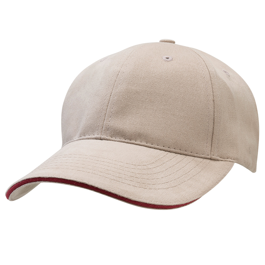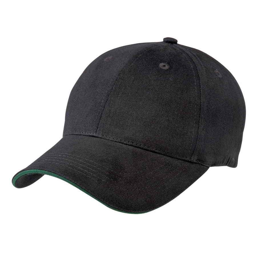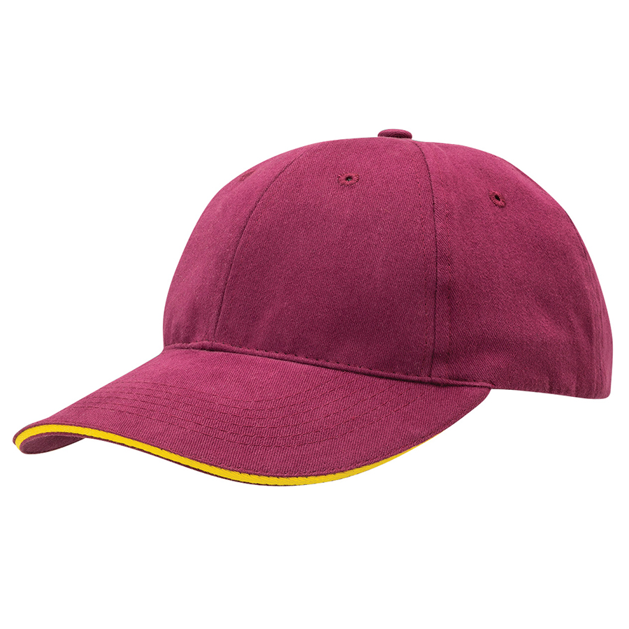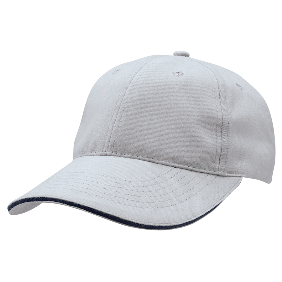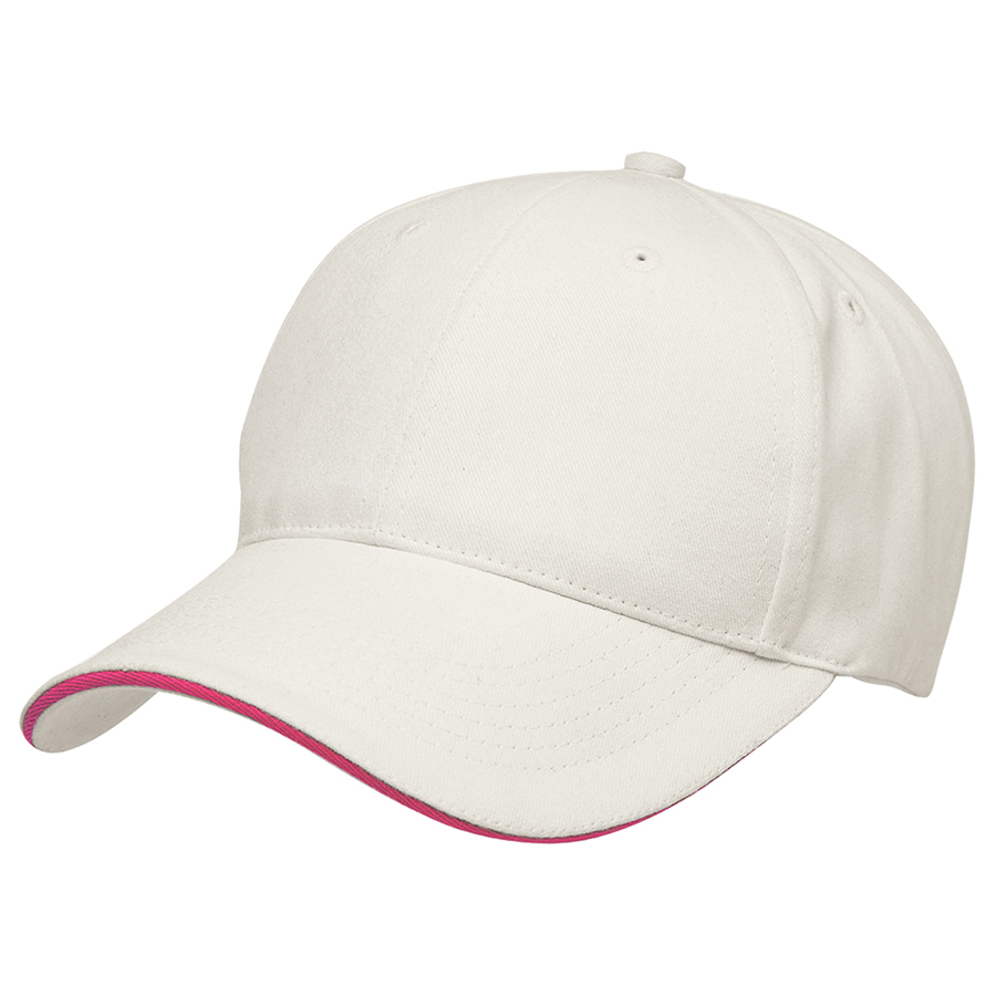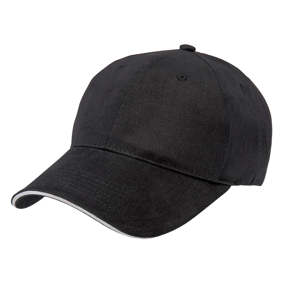 The contrast colour in the sandwich peak is a perfect companion to your company logo. The assortment of neutral colours provides a stylish background to enhance your logo. Premium soft 100% cotton fabric|Structured 6 panel design with slight pre-curved sandwich peak|Velcro closure|Embroidered eyelets|Comfortable padded sweatband|Great fit on all head sizes